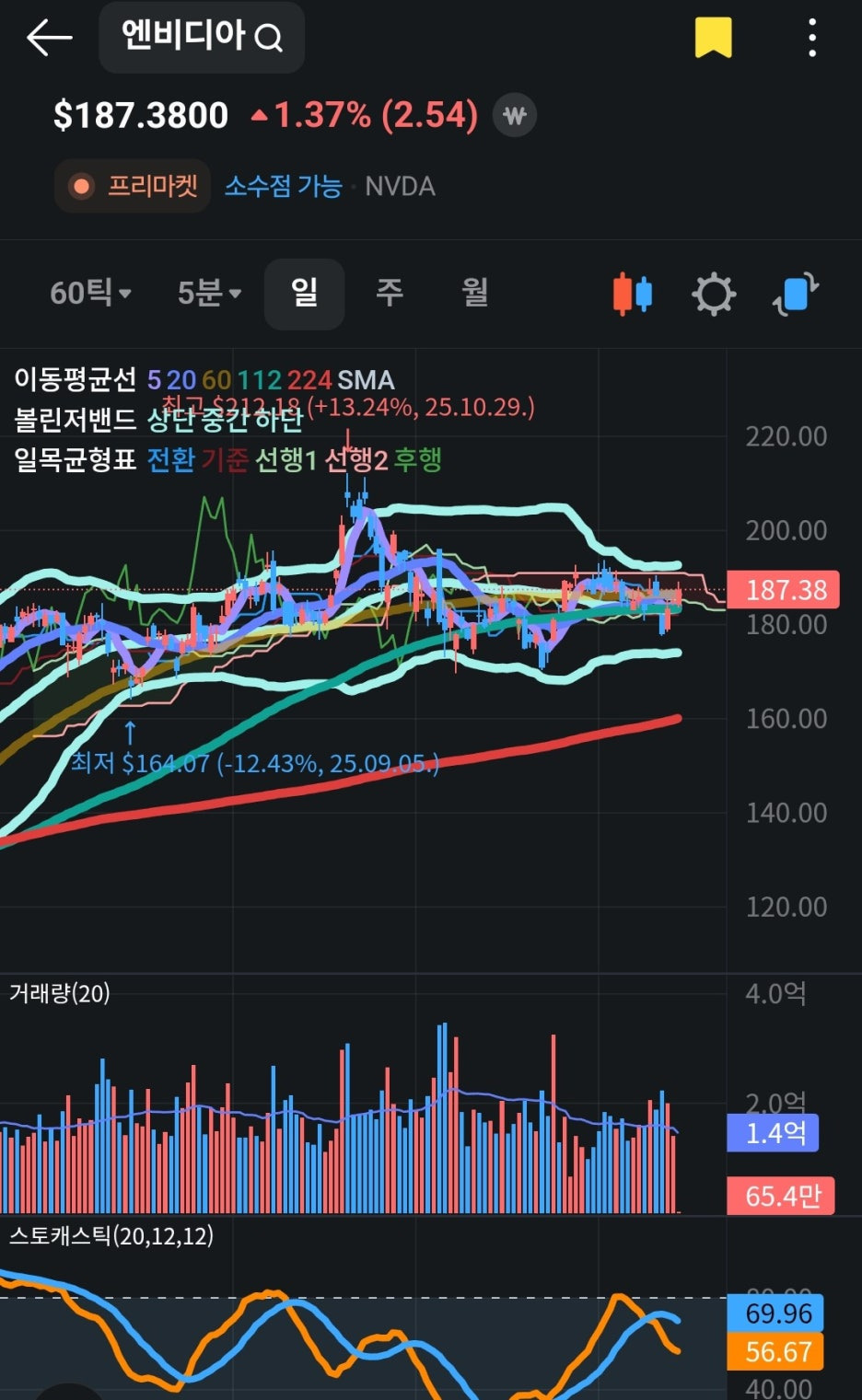 스토캐스틱(20,12,12) 지표상 골든크로스 발생 직전이며, 이동평균선들이 밀집된 구간에서 상방 돌파를 시도 중입니다.