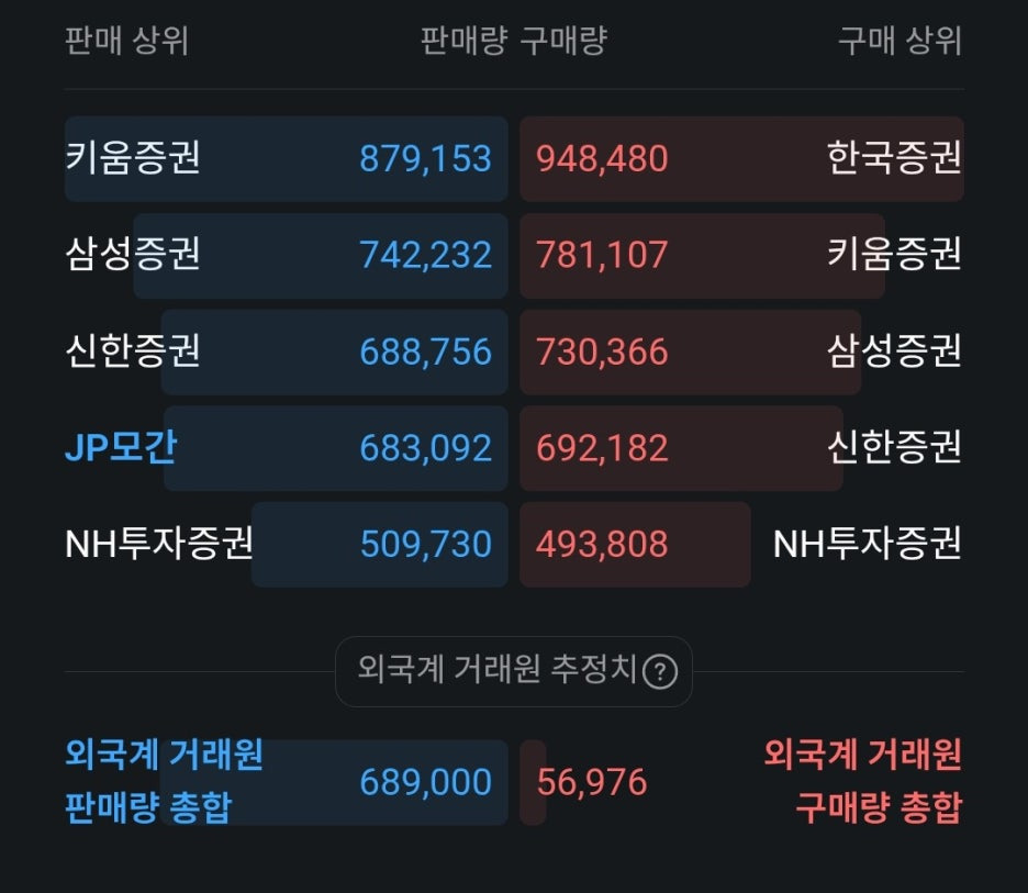- 키움증권: 매도 879,153주 / 매수 781,107주를 기록했습니다. 개인 투자자들이 많이 이용하는 창구인 만큼 활발한 단타 매매와 손바뀜이 일어난 것으로 보입니다.