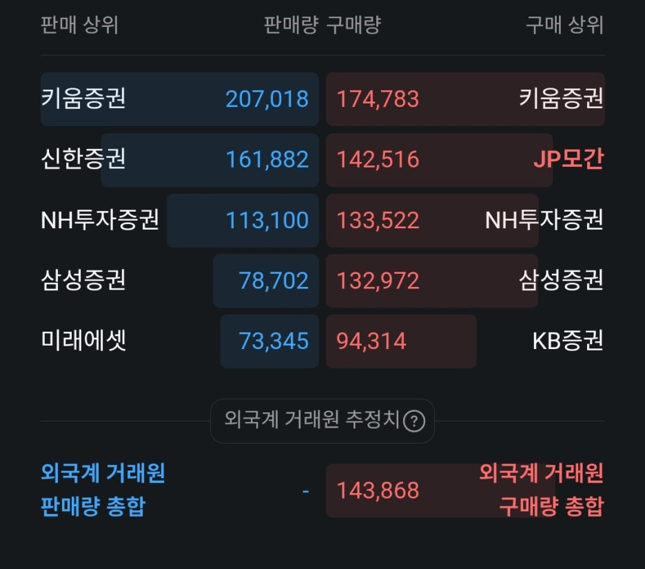가장 많은 매도 물량이 나오고 있는 곳은 키움증권으로 207,018주를 매도 중입니다. 이어 신한증권이 161,882주, NH투자증권이 113,100주를 쏟아내고 있습니다. 삼성증권과 미래에셋 역시 각각 7만 주 이상의 매도세를 보이고 있습니다. 주로 개인 투자자 비중이 높은 국내 대형 증권사들을 중심으로 차익 실현 혹은 투매 물량이 나오고 있는 것으로 해석됩니다.