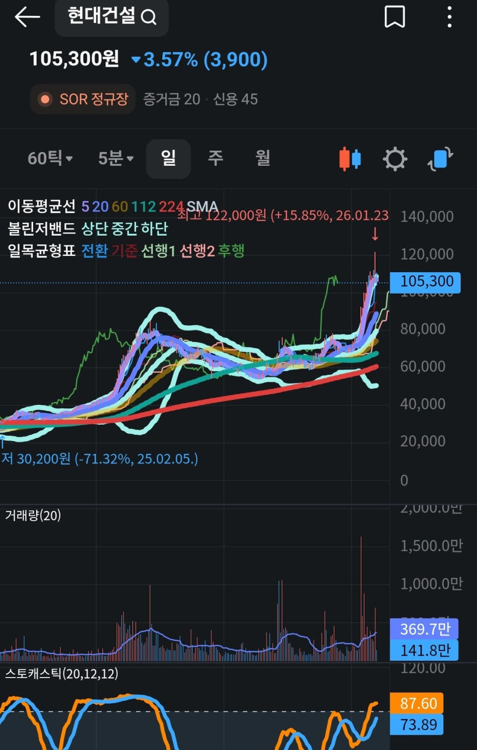 현재 주가는 52주 신고가 부근에서 조정을 받는 모습입니다. 하지만 2026년은 현대건설이 단순 건설사에서 글로벌 에너지 EPC 기업으로 재평가받는 원년입니다. 지금의 하락은 무릎에서 살 수 있는 마지막 기회일 수 있습니다. 10만 원 선이 강력한 지지선 역할을 할 것으로 보이므로, 이 가격대에서 분할 매수로 접근하는 전략이 유효합니다.