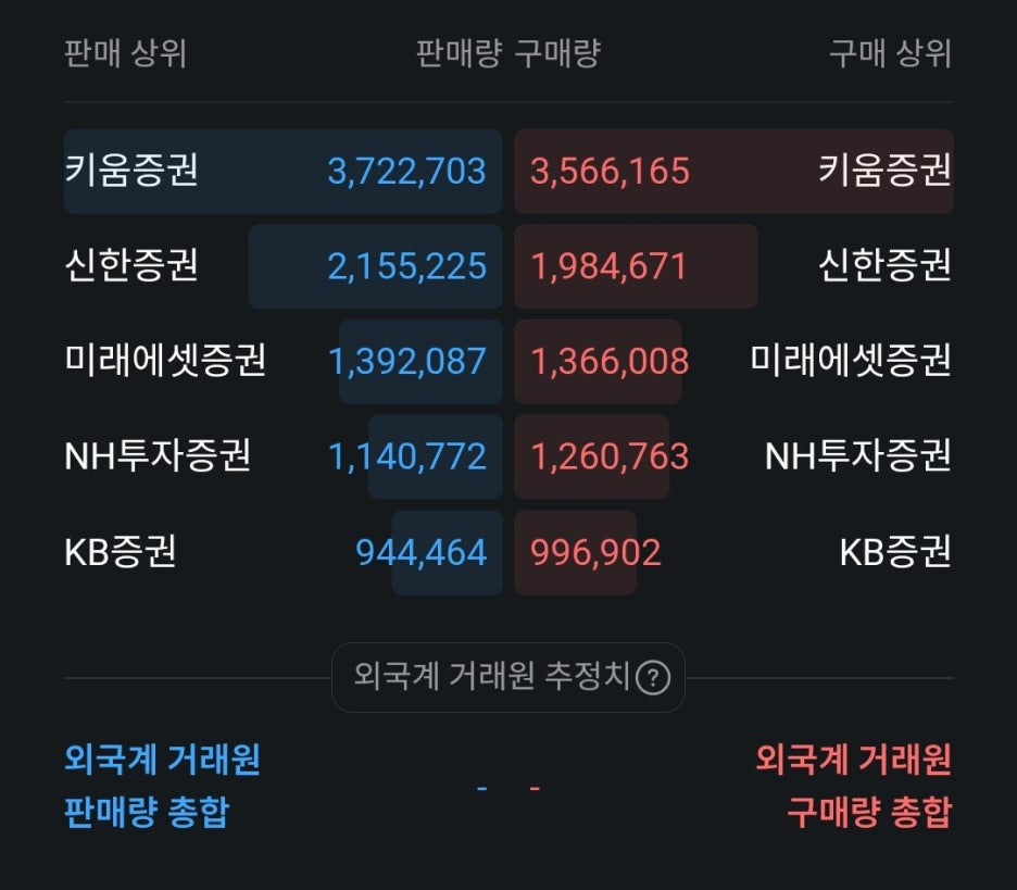 - 미래에셋과 NH투자증권 역시 백만 주 단위의 활발한 거래를 보이고 있습니다. 특이점은 NH투자증권과 KB증권의 경우, 매도량보다 매수량이 근소하게 많다는 점입니다. 이는 특정 창구를 통해 저가 매수세가 유입되고 있음을 의미합니다.