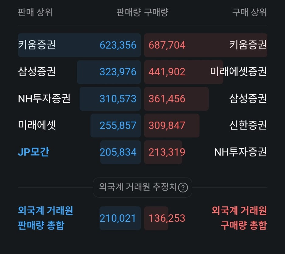 - 외국계 창구인 JP모간이 판매 상위 5위에 이름을 올리고 있습니다. 오늘 하락의 주요 원인 중 하나로 외국인의 차익 실현 혹은 비중 축소 움직임을 꼽을 수 있겠네요.