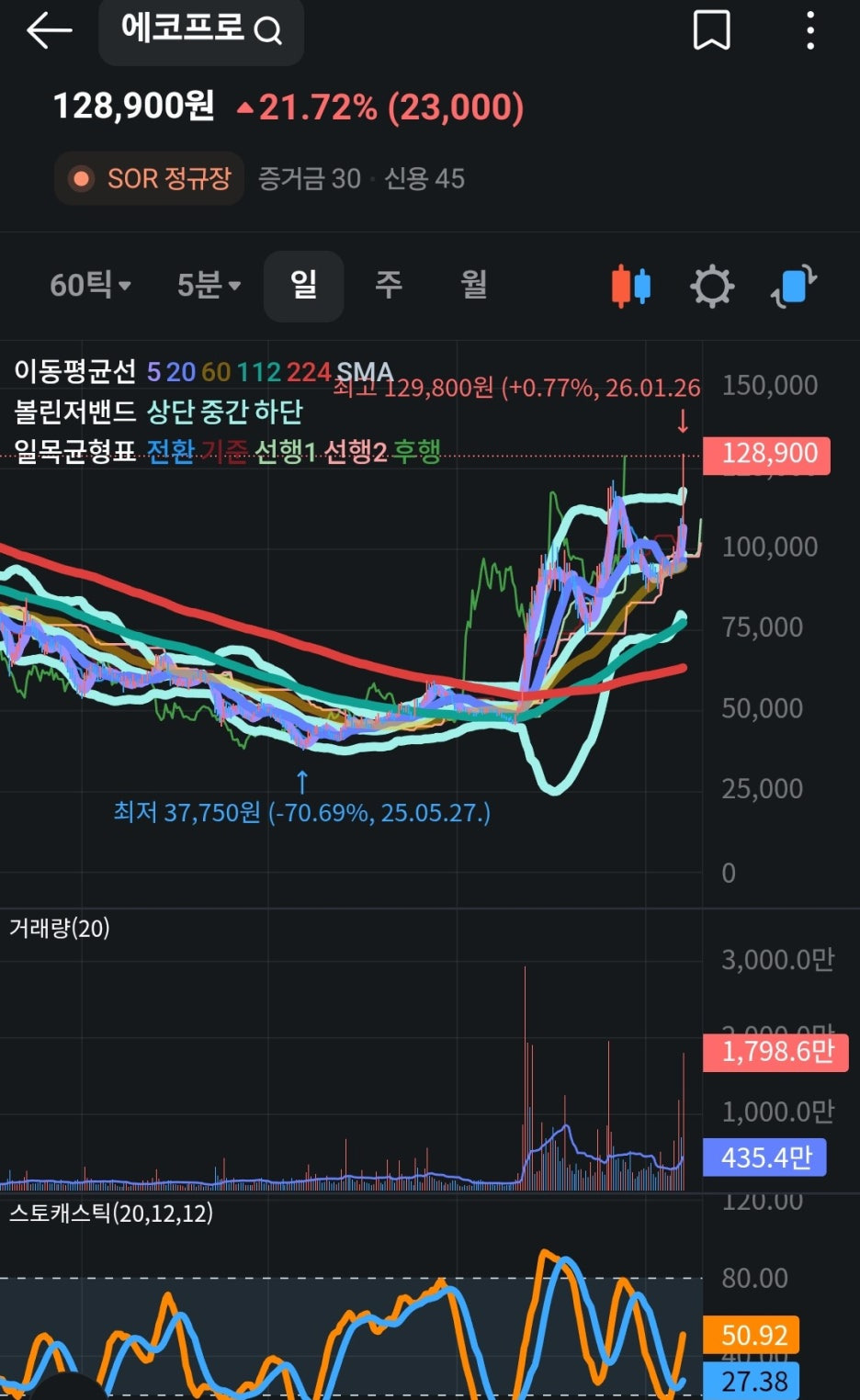 에코프로는 오늘 하루 동안 22,000원이 오르며 127,900원에 거래되고 있습니다. 장중 내내 매수세가 유입되며 우상향 곡선을 그렸고, 이는 2차전지 섹터 전반에 대한 기대감이나 에코프로만의 개별 호재가 강력하게 작용했음을 시사합니다.