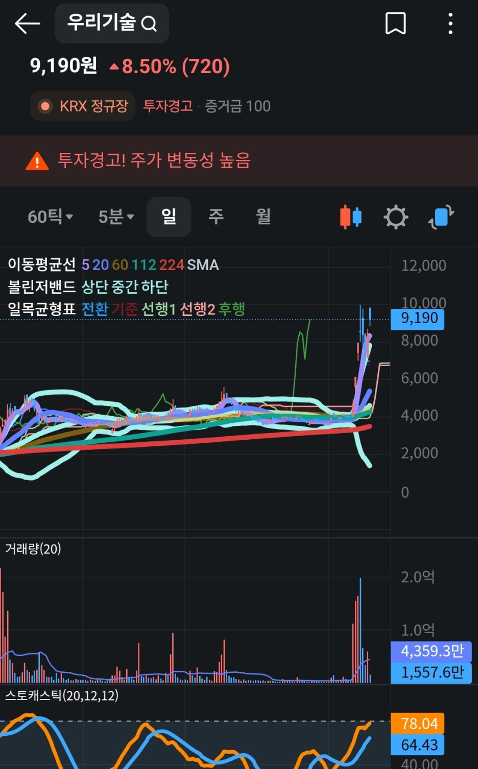 현재 차트상 주가가 급격히 상승하며 투자경고가 뜰 만큼 변동성이 커진 상황입니다. 냉철한 분석이 필요합니다.