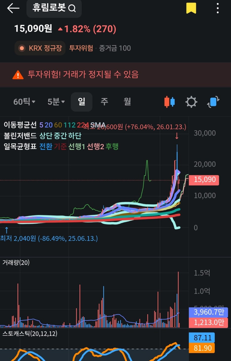 증권가에서는 휴림로봇이 단순 제조사를 넘어 '종합 로봇 플랫폼 기업'으로 도약하는 구간이라고 평가합니다. 다만, 차트상 급격한 각도로 상승한 만큼 신중한 접근이 필요합니다.