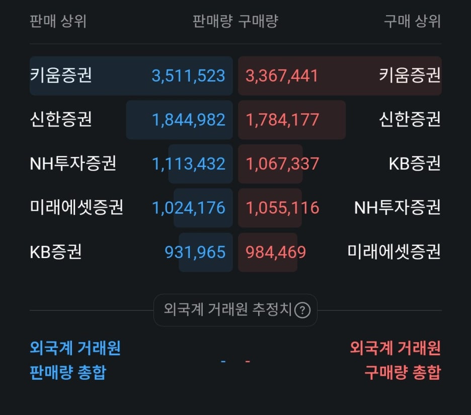 - 개인 투자자의 활발한 참여: 키움증권이 압도적인 거래량(매수/매도 합산 약 680만 주)으로 1위를 기록하고 있습니다. 이는 개인 투자자들의 단기 매매와 수급 참여가 매우 활발하다는 것을 의미합니다.