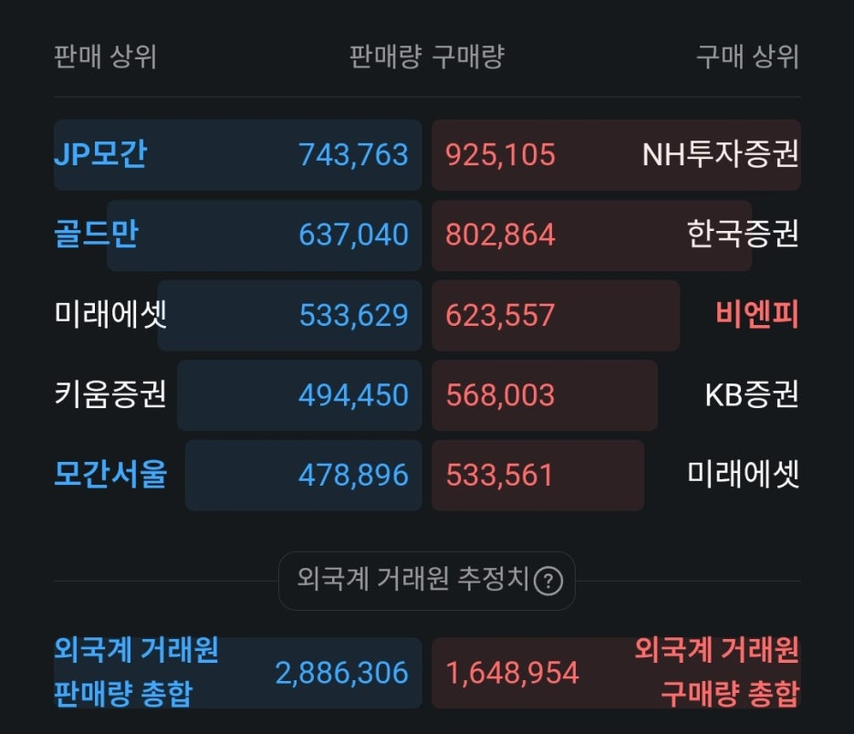 거래원 집계에 따르면 외국계 창구의 판매량 총합은 약 288만 주에 달하는 반면, 구매량 총합은 약 164만 주에 그쳤습니다. 결과적으로 외국인들은 오늘 하루에만 약 123만 주 이상의 순매도를 기록하며 차익 실현 또는 포트폴리오 조정에 나선 것으로 보입니다.