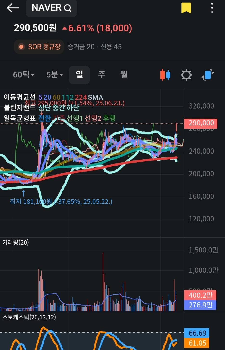 네이버는 현재 288,500원으로 강한 상승세를 보이고 있습니다. SOR 정규장 상태에서 증거금 20, 신용 45 비율로 거래되고 있으며, 거래량이 실린 장대 양봉이 예상되는 우호적인 분위기입니다.