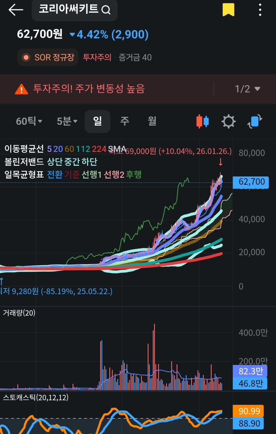 차트를 보시면 어제(26.01.26) 69,000원이라는 역사적 고점을 찍은 후, 오늘 약 4.42% 하락한 62,700원에 마감했습니다.