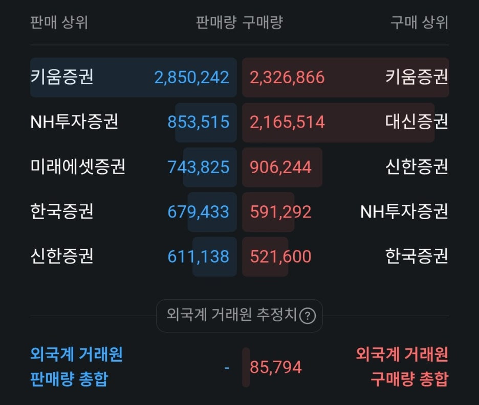 판매와 구매 양쪽에서 압도적인 1위를 차지한 곳은 키움증권입니다. 이는 개인 투자자들의 손바뀜이 매우 활발하게 일어났음을 의미합니다. 단기 차익 실현 매물과 상한가를 노린 추격 매수가 동시에 몰린 것으로 보입니다.