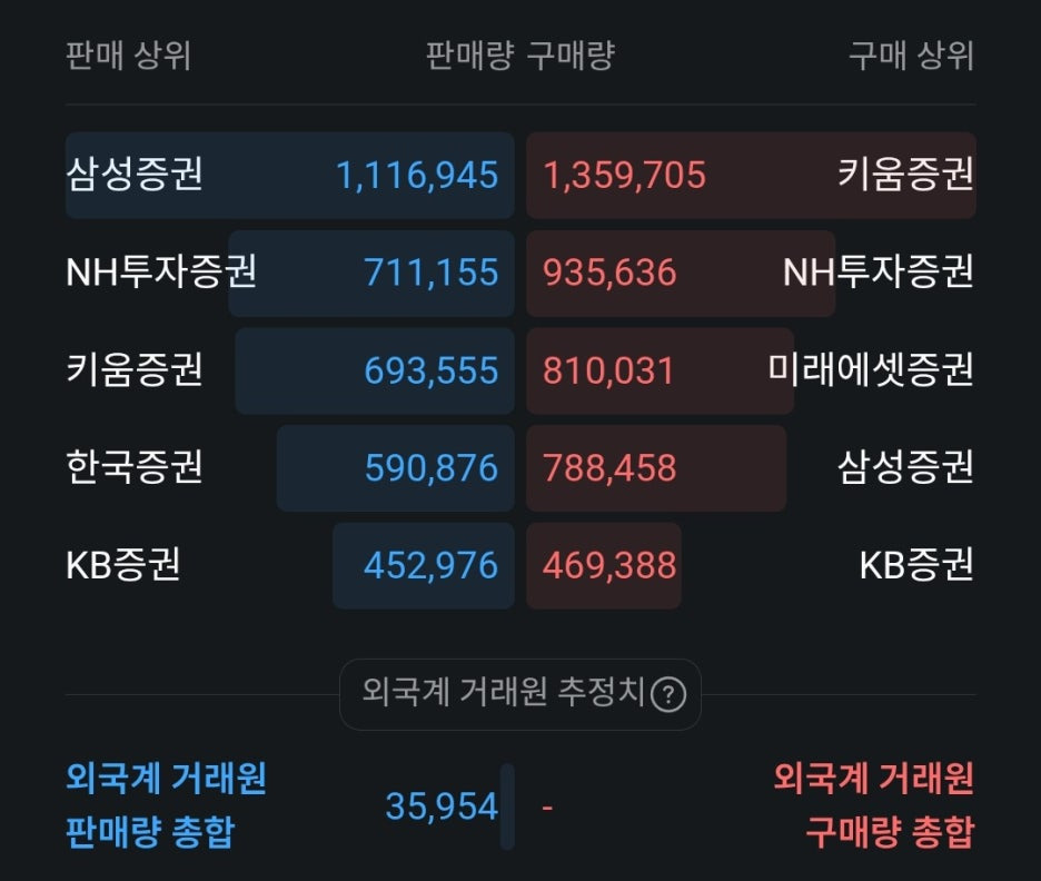 판매 상위 1위인 삼성증권은 약 111만 주를 매도하며 공급을 주도했습니다. 구매량은 약 78만 주로, 순매도 우위를 보이고 있습니다. 대형 창구에서의 이러한 이탈은 기관이나 고액 자산가들의 비중 축소 가능성을 보여줍니다.