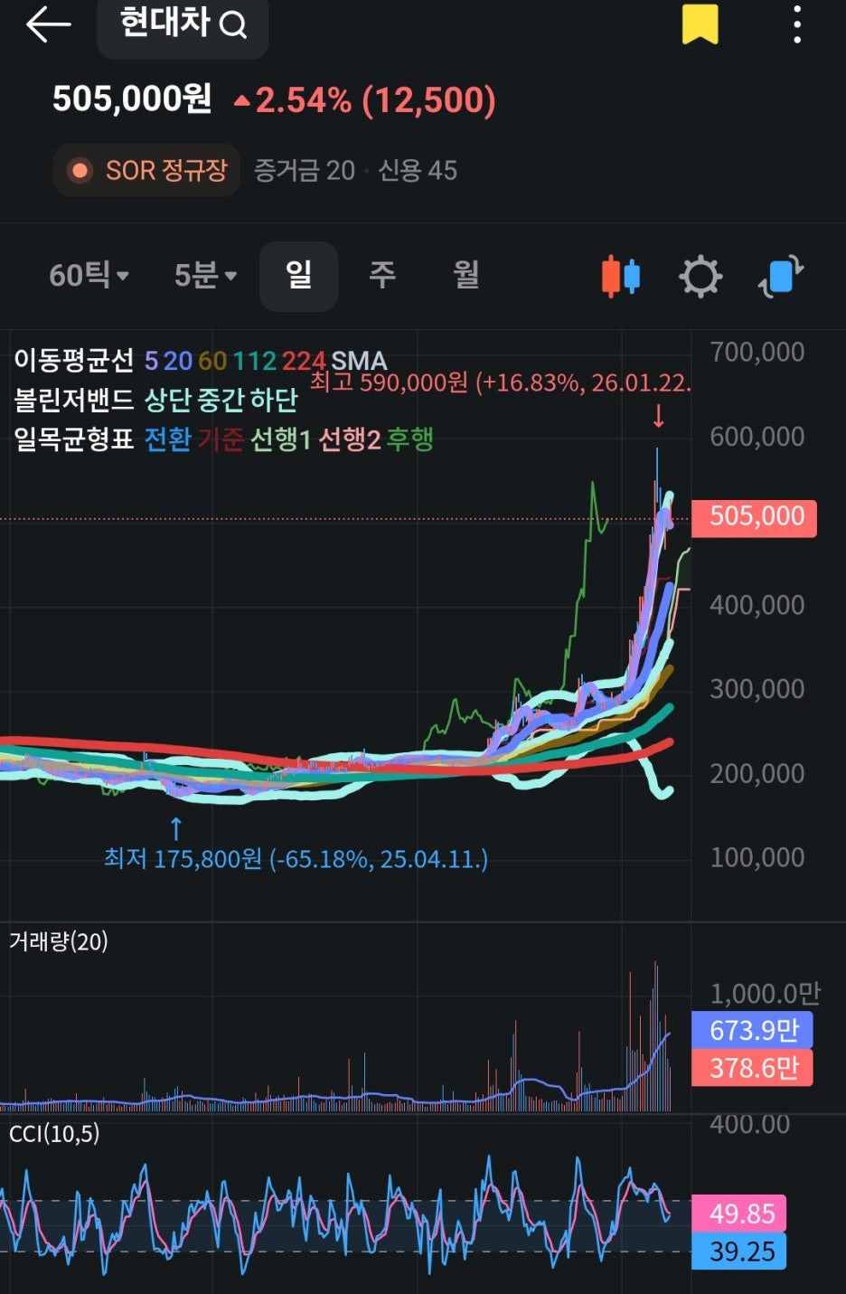 종합적으로 볼 때, 현대차는 강력한 수급을 바탕으로 고점을 높여가고 있습니다. 단기적으로는 외국인 매도세를 국내 수급이 얼마나 잘 받아내느냐가 추가 상승의 관건이 될 것으로 보입니다.