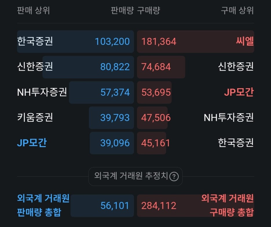 - 매수 상위 창구를 보면 씨엘(CLSA)이 181,364주로 가장 많은 물량을 받아내고 있으며, JP모간 역시 53,695주를 매수하며 상위권에 이름을 올렸습니다. 반면 매도 상위에는 한국증권, 신한증권 등 국내 창구가 이름을 올리고 있어, 국내 기관이나 개인의 물량을 외국계 자금이 흡수하는 양상이 뚜렷합니다.