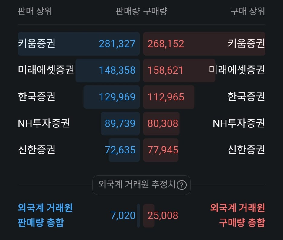 - 개인 투자자의 활발한 손바뀜: 키움증권이 매수/매도 양측에서 압도적인 거래량을 기록하고 있습니다. 이는 개인 투자자들 사이에서 단기 차익 실현과 신규 진입이 매우 활발하게 일어나고 있음을 시사합니다.