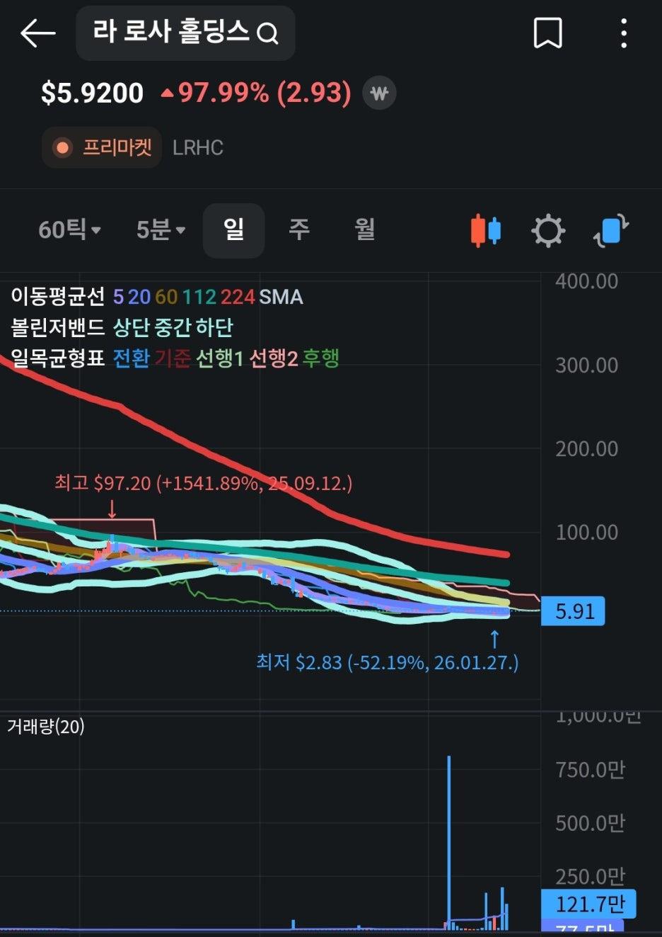 주의사항: LRHC는 시가총액이 작고 변동성이 극도로 높은 '스몰캡' 종목입니다. 공격적인 투자 성향을 가진 분들에게 적합하며, 반드시 손절선을 지키는 대응이 필요합니다.