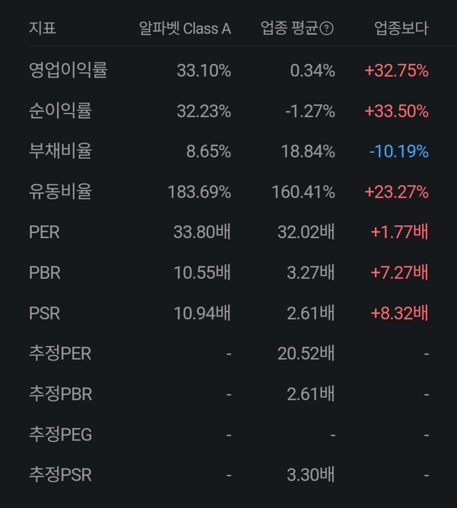 - PBR (10.55배) & PSR (10.94배): 장부 가치나 매출 대비 주가는 업종 평균보다 확연히 높습니다. 이는 시장이 구글의 브랜드 가치와 독점적 시장 지위, 그리고 미래 성장성에 높은 점수를 주고 있음을 의미합니다.