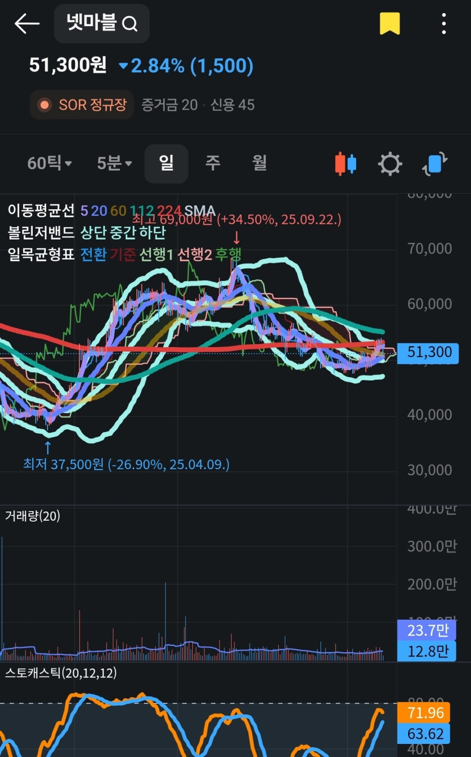 현재 넷마블의 주가는 51,300원으로 전일 대비 2.84%(1,500원) 하락하며 조정을 받는 모습입니다.