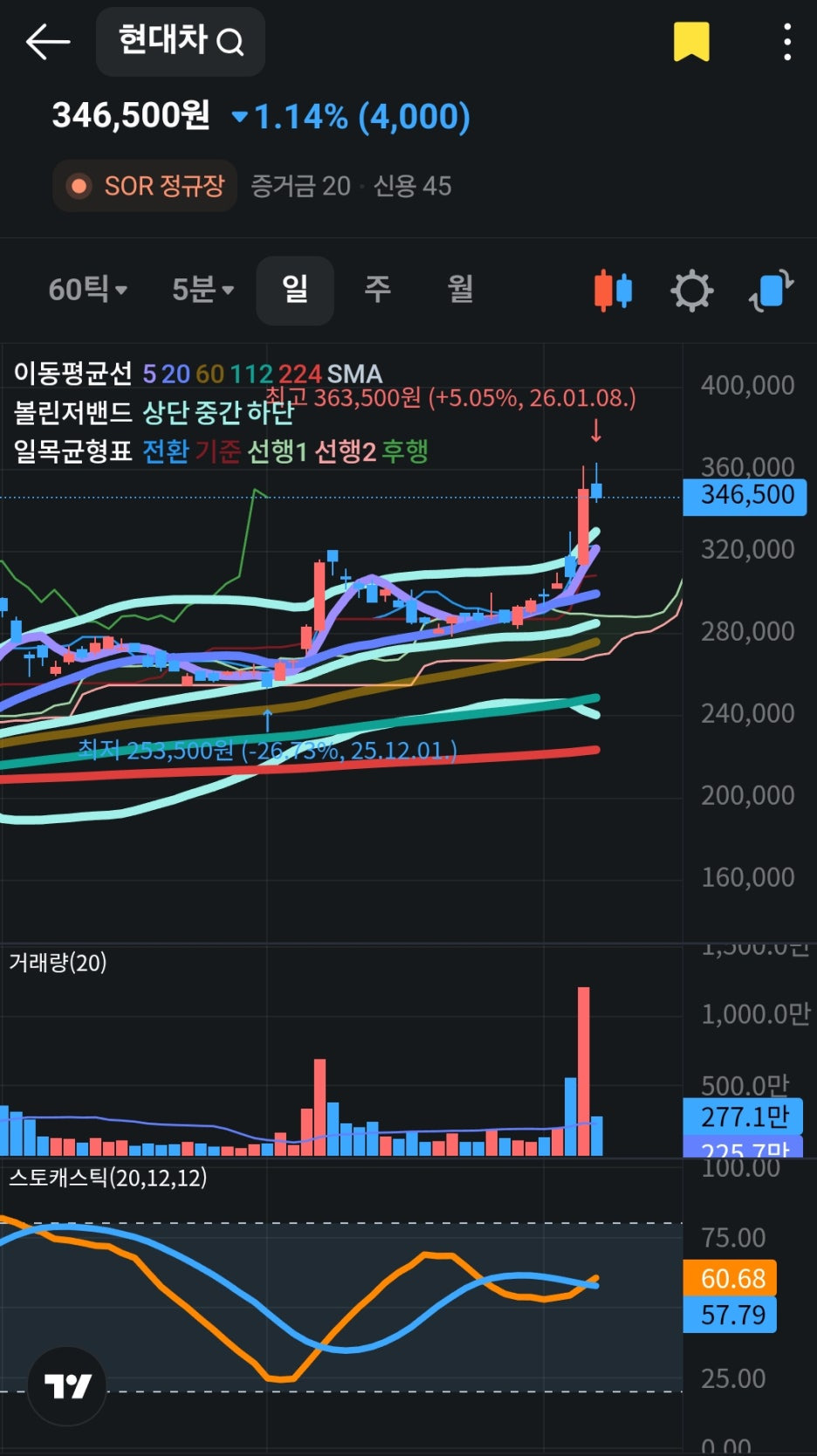 - 스토캐스틱 지표: 하단 지표를 보면 파란색/주황색 선이 고점에서 꺾이려 하고 있습니다. 이는 단기 조정을 암시하므로 며칠간 지켜보며 음봉이 나올 때를 기다리세요.