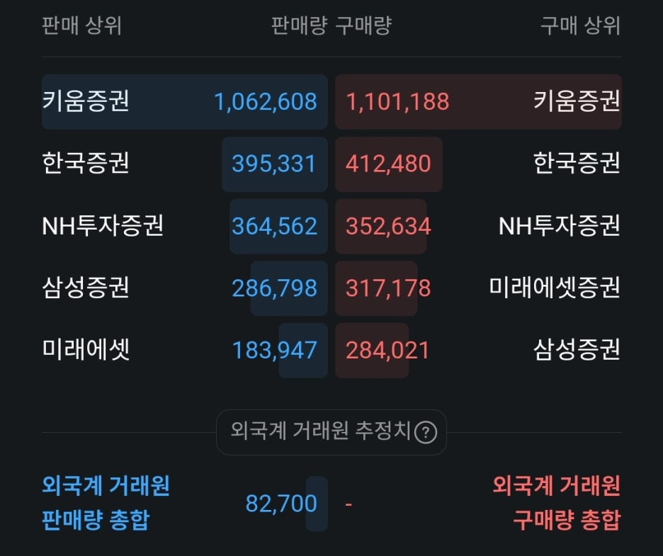 - 미래에셋증권의 강한 순매수: 오늘 가장 눈에 띄는 창구는 미래에셋입니다. 매도 대비 매수 물량이 현저히 많으며, 약 13.3만 주의 순매수를 기록하며 주가 상승의 탄력을 뒷받침했습니다.
