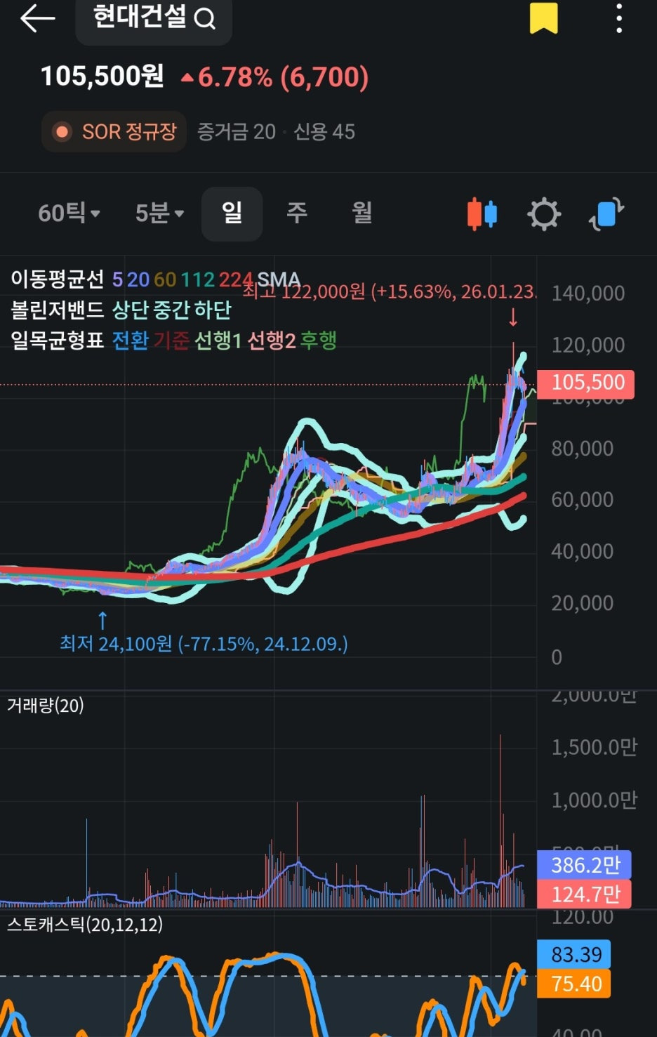 현대건설은 현재 52주 신고가 근처에서 강력한 매수세가 유입되고 있습니다. 차트상 거래량을 동반한 장대 양봉이 출현하며 직전 고점 돌파를 시도하는 모습입니다.