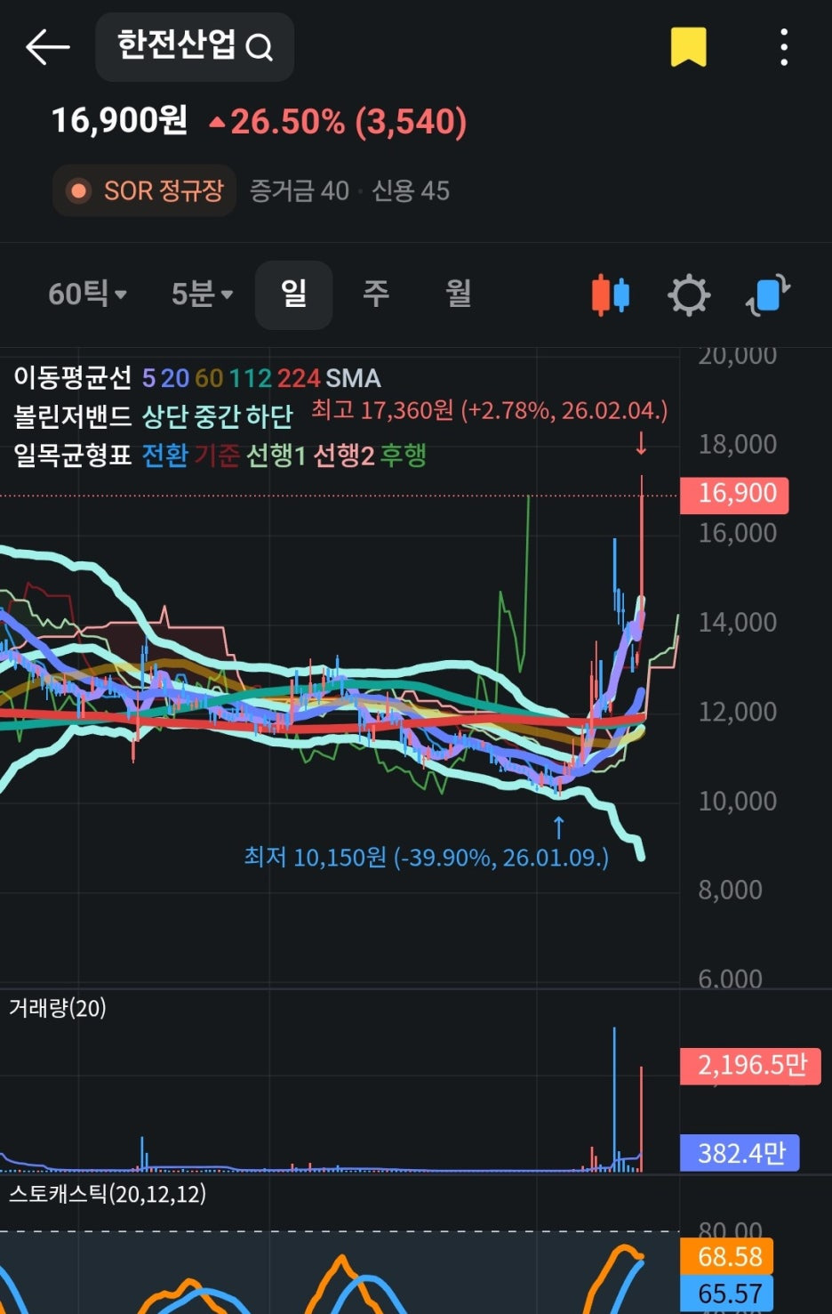 - 상태: 거래량이 동반된 강력한 장대양봉 형성 중