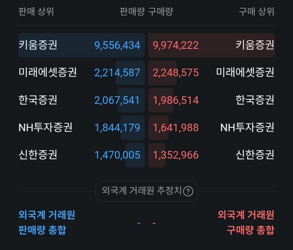 - 키움증권의 압도적 거래량: 매수와 매도 모두 키움증권이 압도적입니다. 이는 현재 시장의 뜨거운 관심사가 개인 투자자들의 단기 수급과 맞물려 있음을 시사합니다. 특히 키움에서 약 41만 주의 순매수가 발생한 것은 개인 세력의 유입이 강하다는 증거입니다.