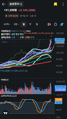 차트와 오늘(2026년 1월 8일 장중) 시장 상황을 바탕으로 삼성전자의 현재와 미래를 정밀하게 분석해 드립니다. 오늘 삼성전자는 장중 144,500원이라는 역대 최고가를 경신하며 뜨거운 관심을 받고 있습니다. 그렇지만 다시 내려와서 수익률 0%에서 왔다 갔다 하고 있네요.