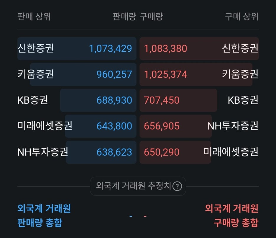 - 신한증권의 압도적인 거래량: 매도와 매수 모두 1위를 기록하며 시장의 주도권을 쥐고 있습니다. 매수와 매도 수량이 거의 1:1에 가까워, 현재 가격대에서 치열한 물량 주고받기가 진행 중인 것으로 보입니다.