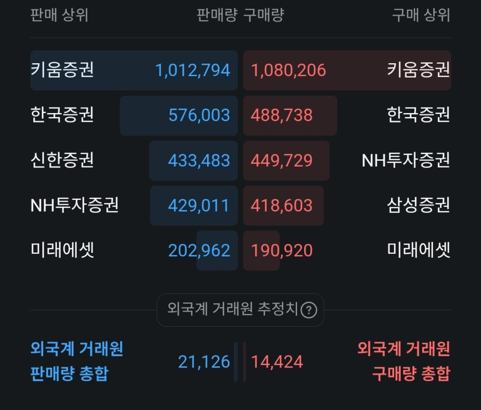 한국증권과 신한증권 창구를 통해서는 매수보다 매도가 더 많이 쏟아지고 있습니다. 특히 신한증권은 매수 상위 5위권에는 보이지 않지만 매도 상위에는 3위로 랭크되어 있어, 해당 창구를 이용하는 기관 혹은 큰손들의 물량 정리가 이어지고 있음을 알 수 있습니다.