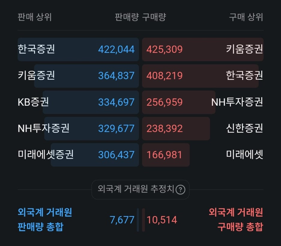 한국증권과 KB증권 창구에서 비교적 큰 매도 물량이 쏟아졌습니다. 특히 한국증권의 경우 매수와 매도가 팽팽하지만 매도량이 살짝 더 우위에 있어, 단기적인 차익 실현이나 포트폴리오 조정 물량이 나오고 있음을 알 수 있습니다.