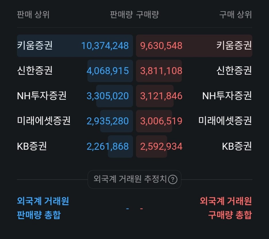 현재 상위 5개 증권사 창구를 통한 거래가 활발합니다. 개미 투자자들의 지표라 불리는 키움증권을 포함해 주요 대형 증권사들의 움직임은 다음과 같습니다.