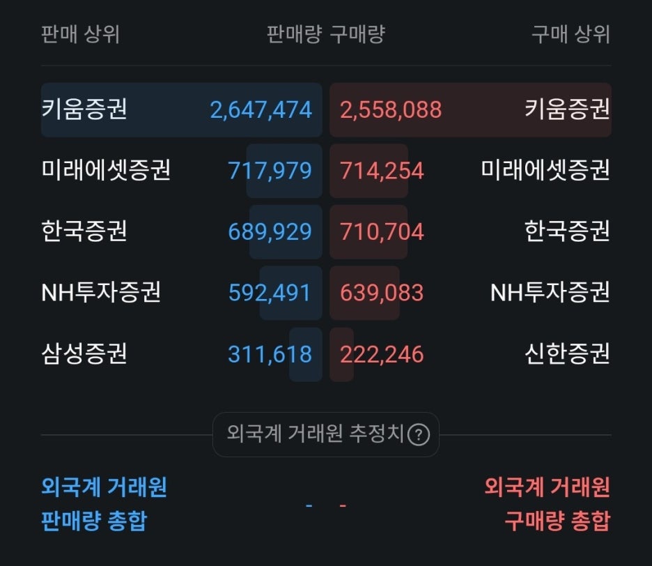- 개인 투자자의 활발한 참여: 개인 투자자들이 주로 이용하는 키움증권과 미래에셋증권의 거래량이 압도적입니다. 이는 오늘 상승장에서 단기 차익 실현 물량과 신규 진입 물량이 격렬하게 부딪혔음을 의미합니다. 특히 키움증권에서 약 9만 주 가량의 순매도가 나온 점은 일부 개인 투자자들이 수익을 확정 지은 것으로 보입니다.