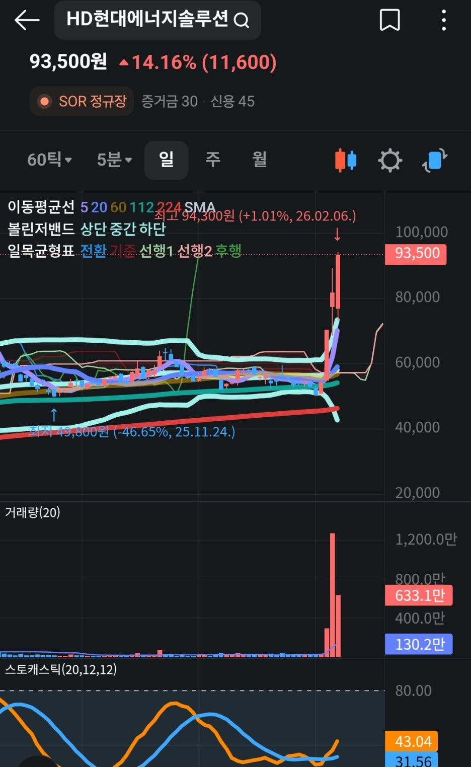 - 고점 판단: 52주 신고가를 경신 중인 상황으로, 거래량이 실린 양봉이 유지되고 있어 추가 상승 여력은 충분합니다. 다만 스토캐스틱 등 보조지표가 과매수 구간에 진입했으므로 단기 변동성에 주의해야 합니다.