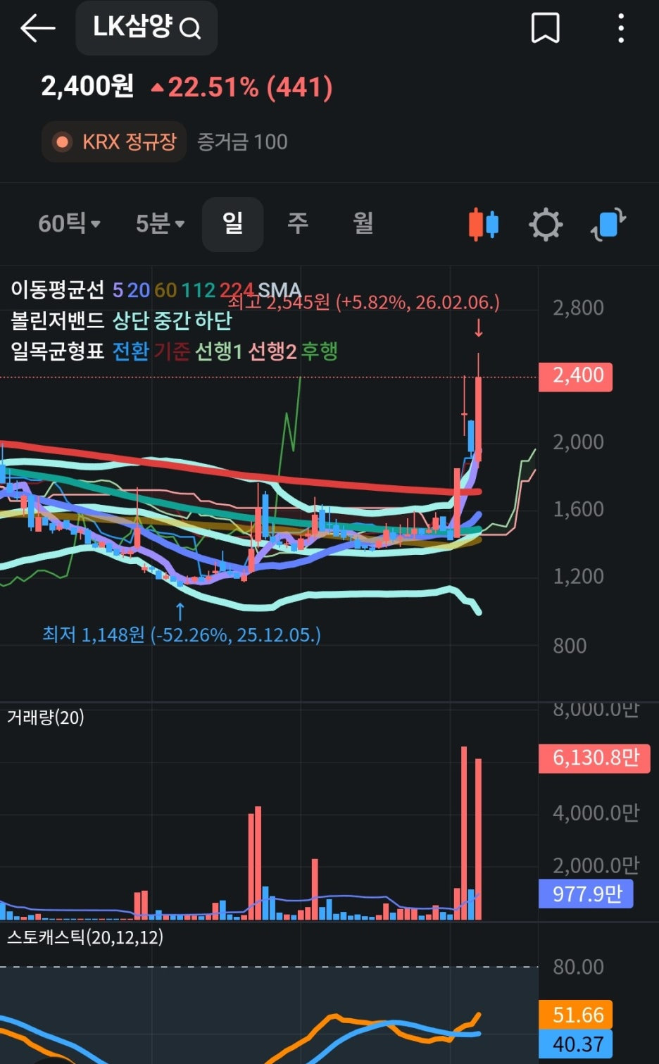 현재 LK삼양은 거래량이 폭발하며 시장의 뜨거운 관심을 받고 있습니다. 키움증권 창구의 물량이 워낙 많아 변동성이 매우 클 것으로 예상되므로 주의가 필요합니다.