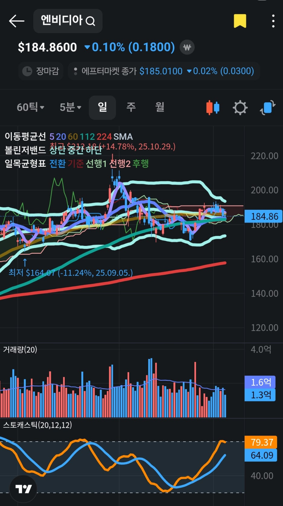 보내주신 차트를 보면 현재 주가는 $184.86 선에서 횡보 중입니다.