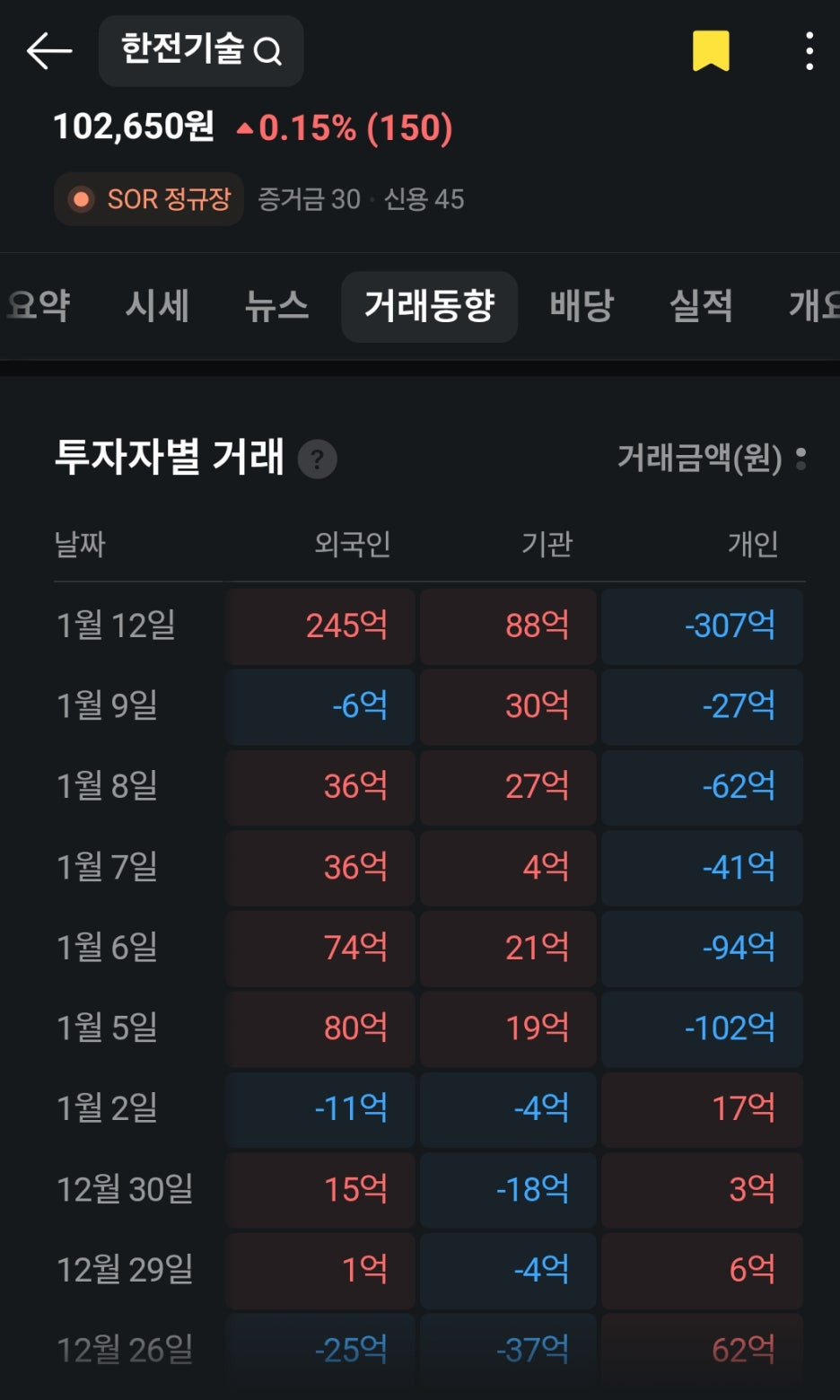 - 개인: 반면 개인 투자자들은 최근 6거래일 동안 지속적으로 차익 실현에 나서고 있습니다. 특히 1월 12일에는 307억 원 규모의 대량 매도세가 출현했습니다.