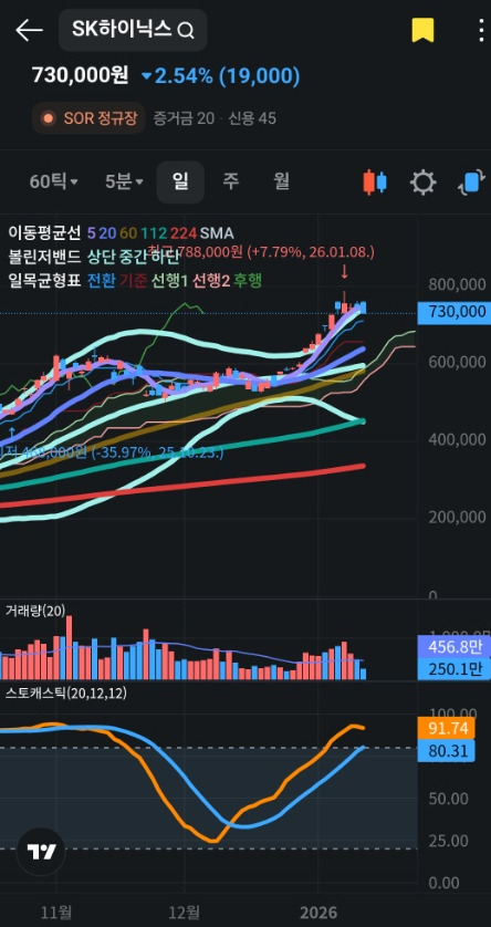 현재 SK하이닉스는 730,000원으로 전일 대비 2.54% 하락한 상태입니다. 최근 788,000원이라는 역사적 고점을 찍은 이후 단기적인 차익 실현 매물이 쏟아지고 있는 상황입니다.