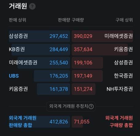 - 외국계 매도 폭격: 외국계 거래원 추정치에서 판매량 총합이 412,826주에 달하는 반면, 구매량은 71,055주에 불과해 압도적인 순매도를 기록했습니다.