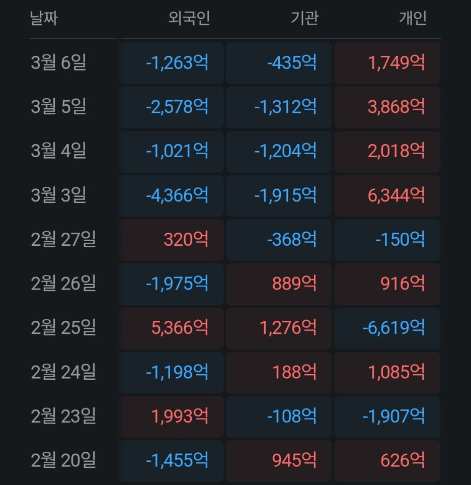 - 외인과 기관이 던진 물량을 개인이 모두 받아내고 있습니다. 3월 3일 하루에만 6,000억 원이 넘는 순매수를 기록하며 주가 하단을 지지하는 '안전판' 역할을 하고 있습니다.