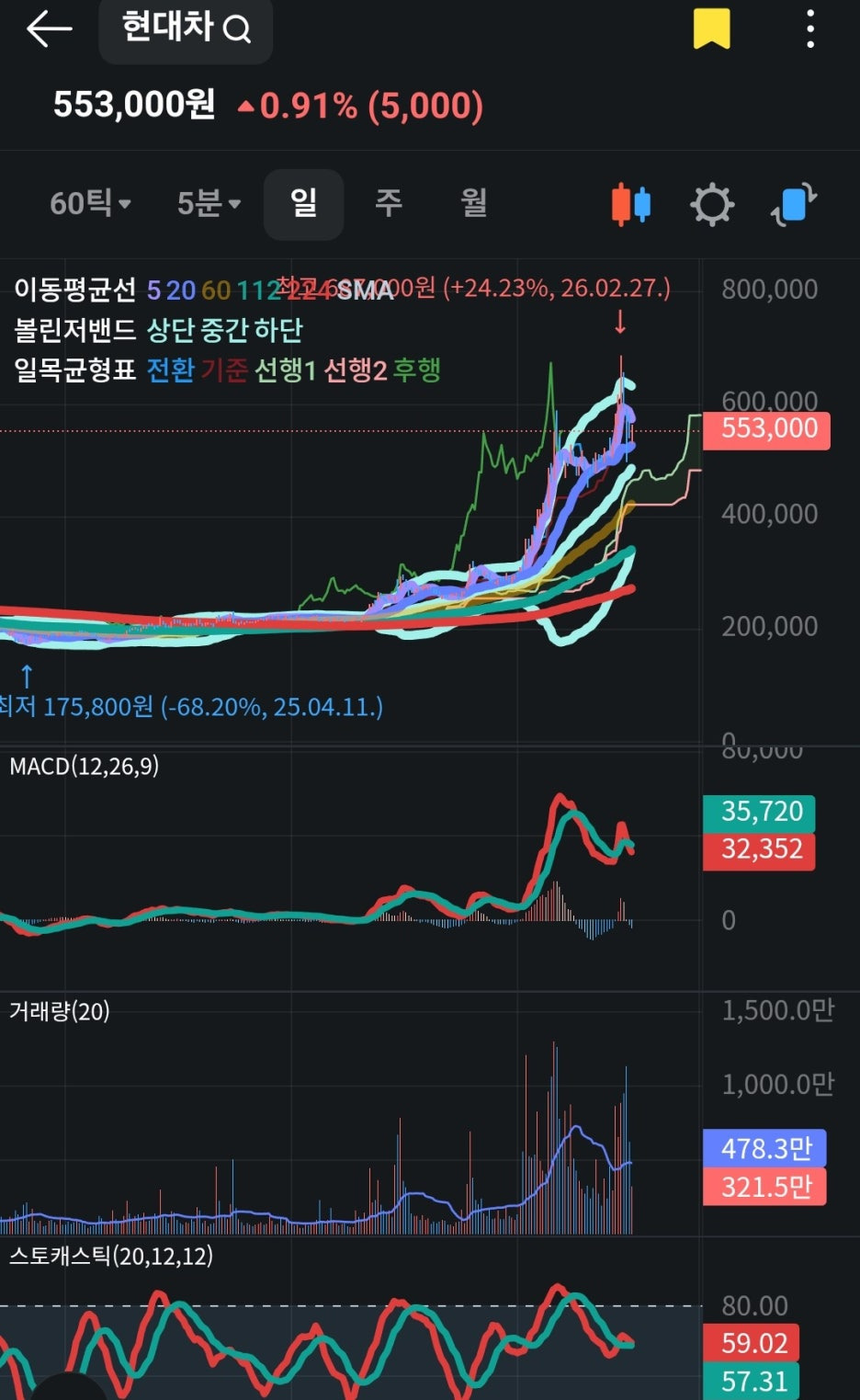 - 판단: 단기적으로는 전고점(60만원대)을 향한 에너지를 응축 중입니다. 완전한 상투(고점)라기보다는 상승 추세 속의 눌림목 구간으로 보입니다.