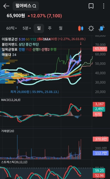 - 차트 분석: 일봉상 이평선들이 완벽한 정배열을 그리며 우상향하고 있습니다. 볼린저 밴드 상단을 타고 올라가는 강한 '상승 추세' 구간입니다.