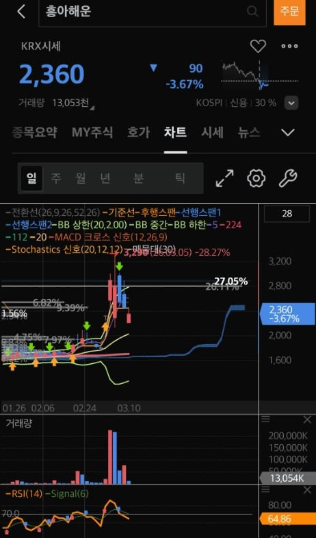 하락 이유: 최근 홍해 리스크 및 지정학적 불안으로 인한 단기 급등(최고 3,290원) 이후 발생하는 차익 실현 매물 소화 과정으로 판단됩니다. 고점 대비 조정 국면에 진입한 모습입니다.