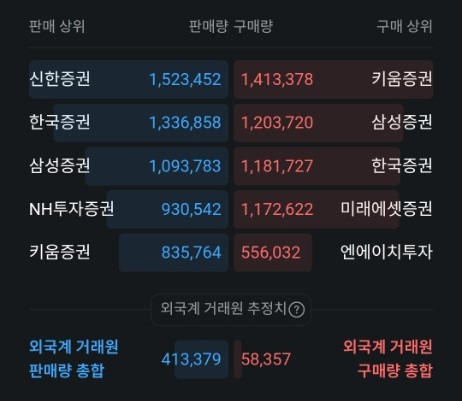 신한증권(152만 주), 한국증권(133만 주) 등 대형 창구에서 매도가 쏟아졌습니다. 반면 키움증권(개인)이 이를 받아내고 있어, 수급 측면에서는 '기관/외인 이탈 vs 개인 매수'의 전형적인 조정 국면입니다.