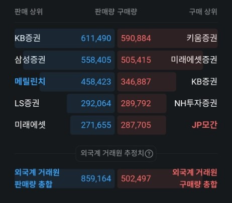 - 매도 상위: KB증권, 삼성증권, 메릴린치 등에서 강한 매도세가 나왔습니다. 특히 메릴린치 등 외국계 창구에서 85만 주가 넘는 대량 매도가 발생하며 하락을 주도했습니다.