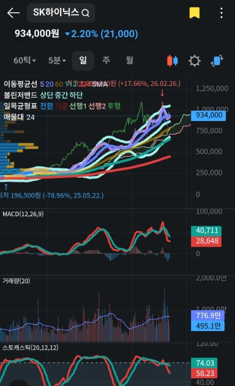 - 차트 분석: 현재 주가는 934,000원으로 2월 고점 대비 소폭 조정을 받는 모습입니다. 이동평균선이 정배열 상태를 유지하고 있으나, MACD와 스토캐스틱 지표가 하향 꺾이며 단기 조정 국면에 진입했음을 시사합니다.