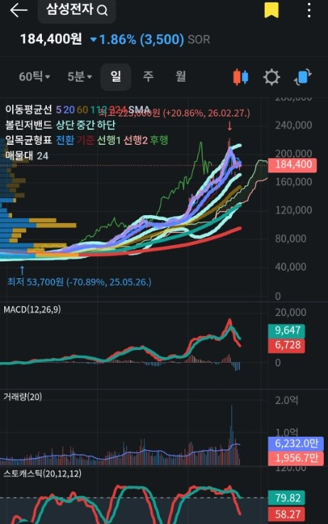 현재 주가는 단기 고점(225,000원) 대비 약 18% 조정받은 상태입니다. 기술적 지표상 스토캐스틱과 MACD가 하향 곡선을 그리고 있어 추가 하락 가능성을 열어두어야 합니다.