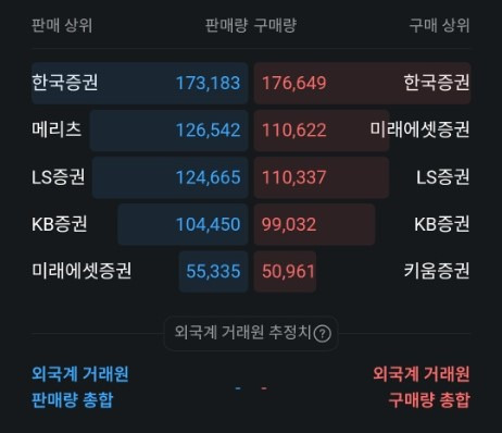 - 매수 상위: 한국증권, 미래에셋, LS증권 등 국내 대형 증권사를 통해 개인 및 기관의 저가 매수세가 유입되고 있습니다. 특히 한국증권의 매수량이 매도량보다 근소하게 앞서며 지지선을 형성 중입니다.