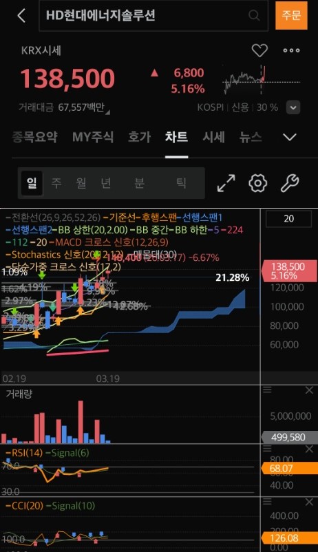 - 보조지표: RSI가 68.07로 과매수 구간(70 이상)에 진입하기 직전입니다. 이는 매수세가 매우 강력하다는 증거지만, 단기적으로는 숨 고르기가 나올 수 있는 지점이기도 합니다.